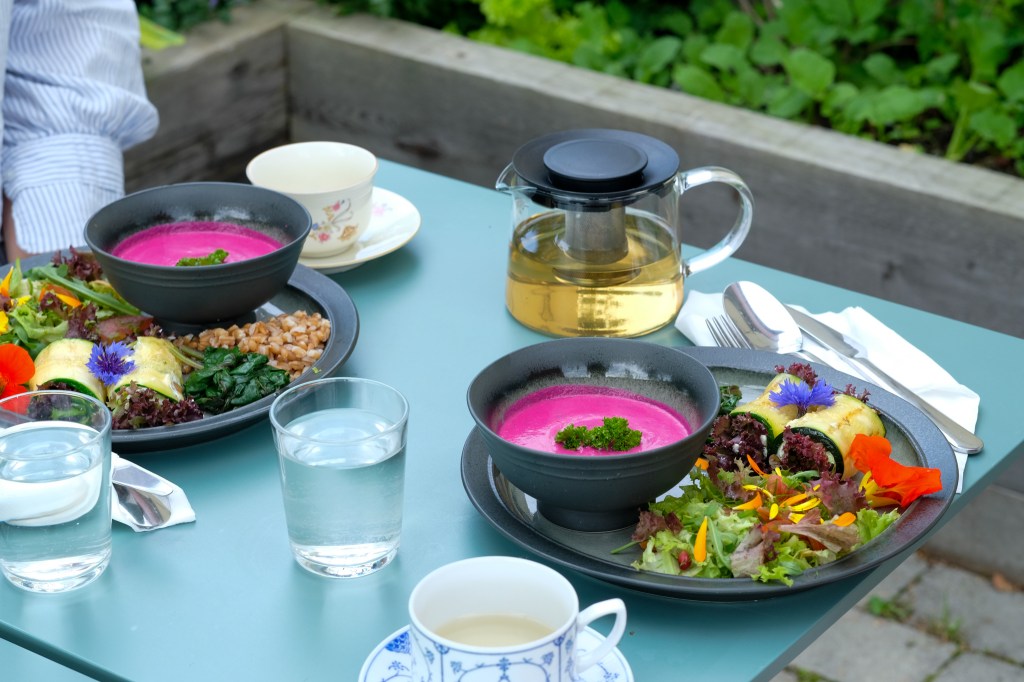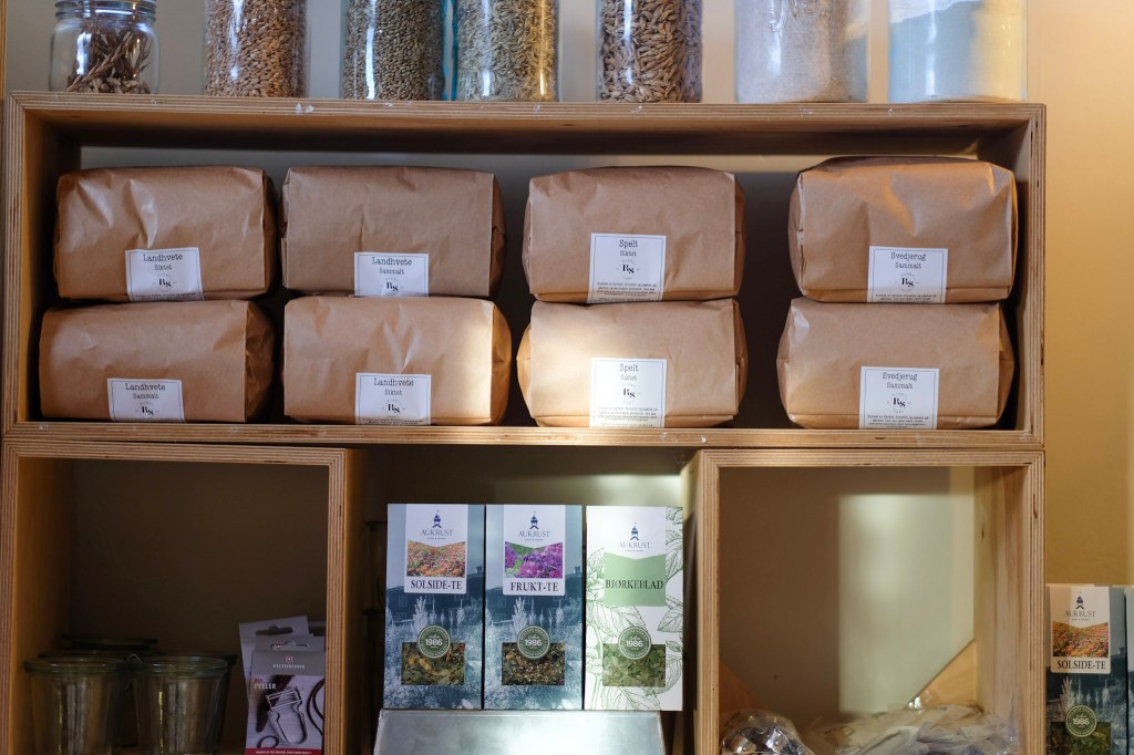 På denne måten bevarer vi jorden og produserer samtidig fantastisk smakfulle grønnsaker til kaféen. Her bruker vi i tillegg mel, egg og kjøtt fra gården, ost og meieriprodukter fra lokale gårder. De fleste av drikkene som serveres – kaffe, te, juice, saft og brus – kommer fra trønderske produsenter, alle fra Norge.